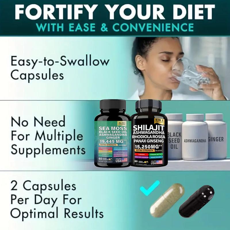 It is a curated set of two high-potency supplements containing 18 of the world's most respected herbal extracts, including Sea Moss, Shilajit, Ashwagandha, and Ginseng.